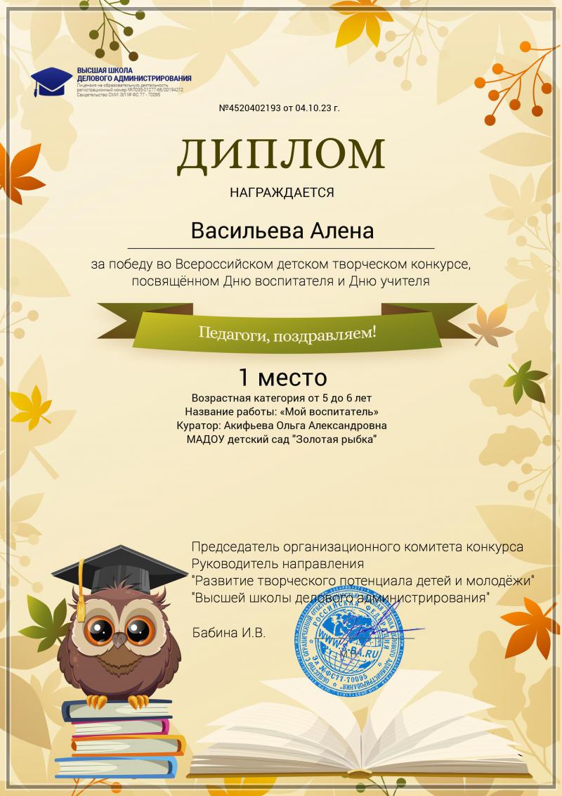 Квалификация: Воспитатель детского сада
