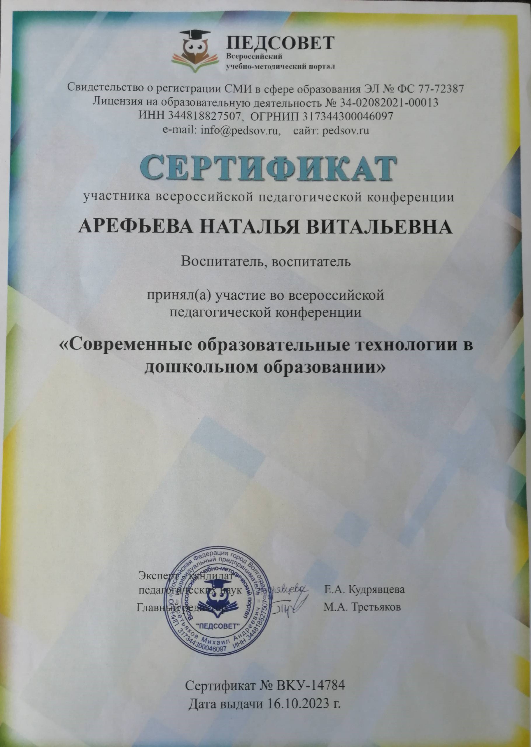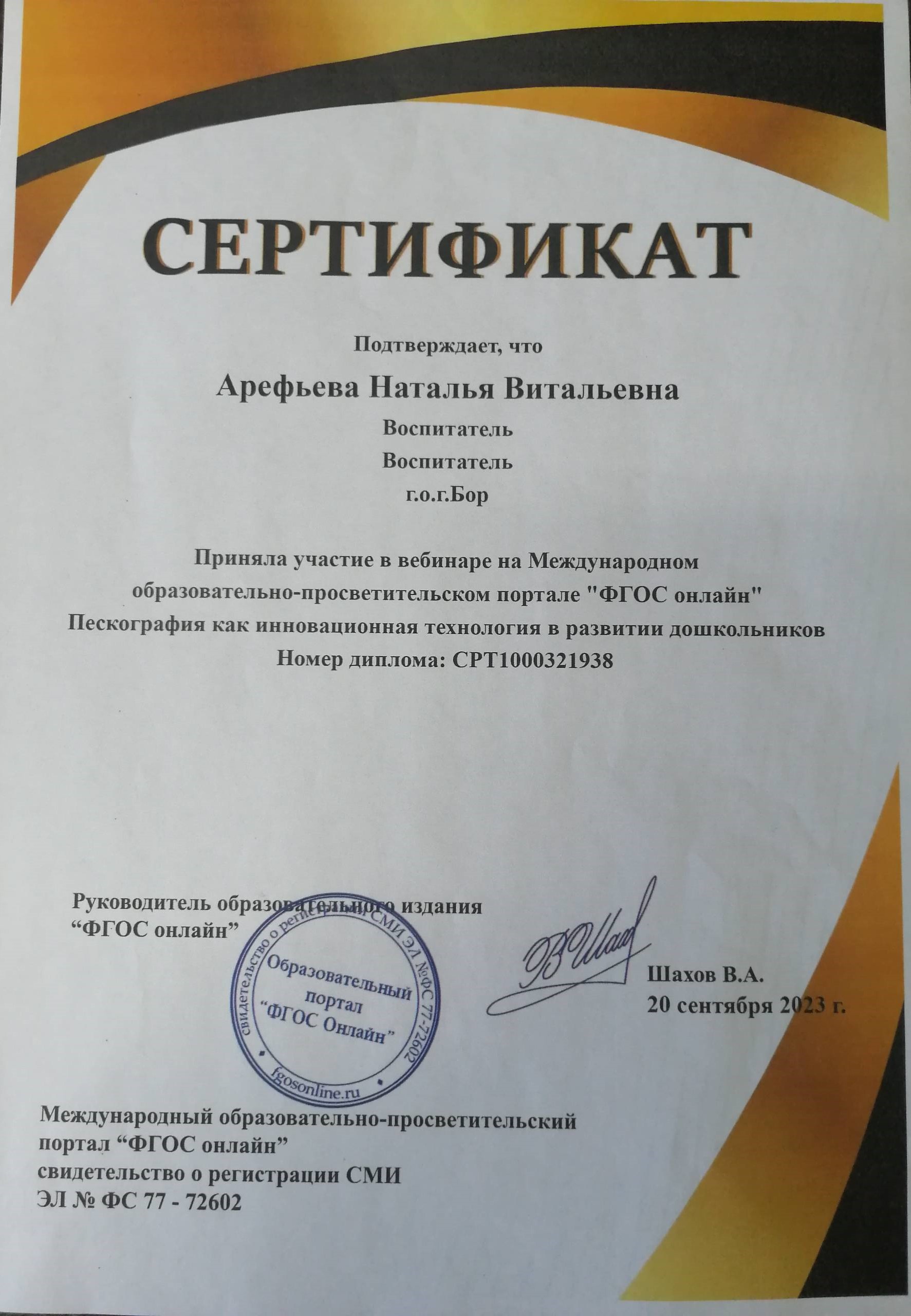 ФИО: Арефьева Наталья Витальевна
